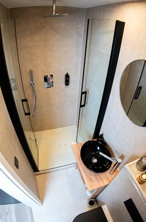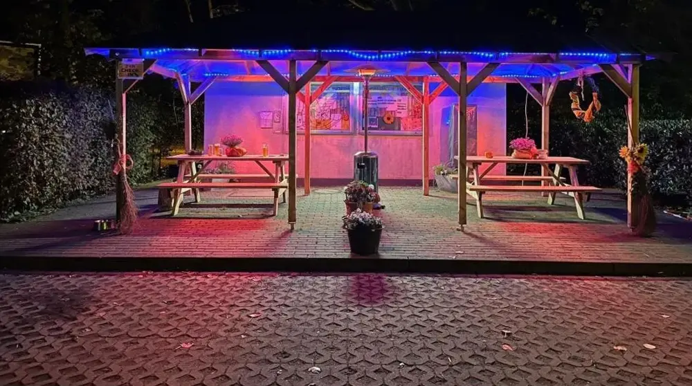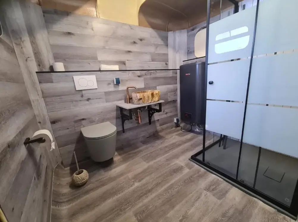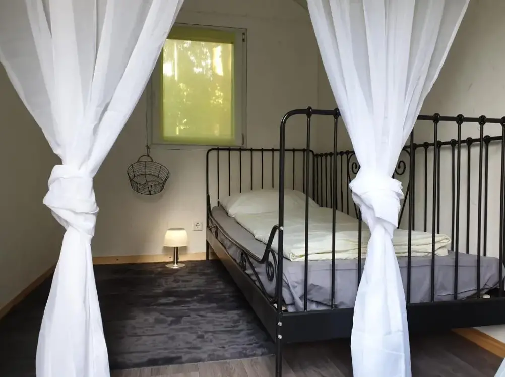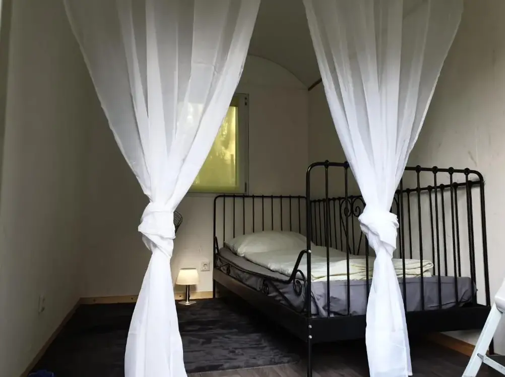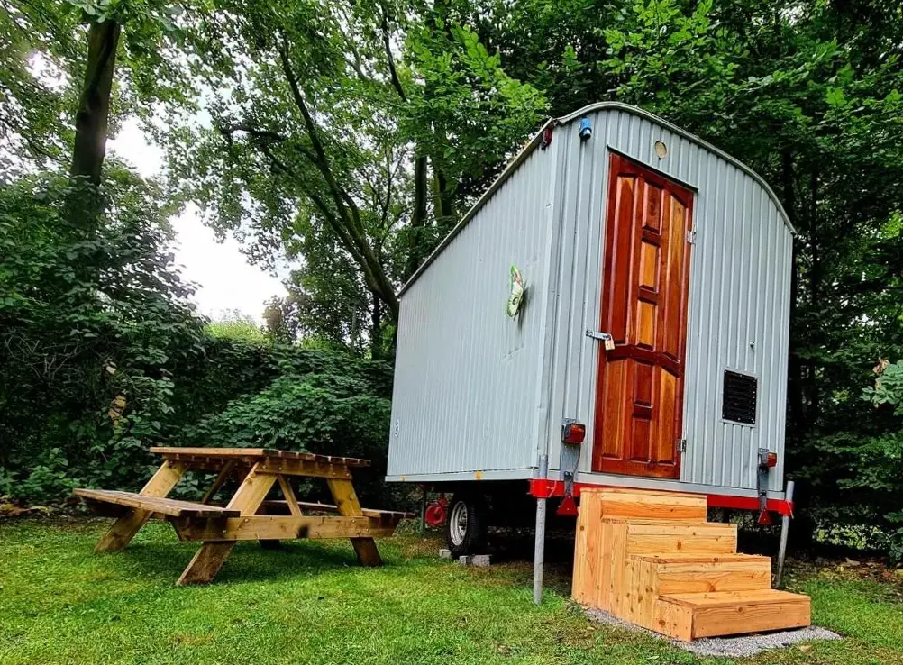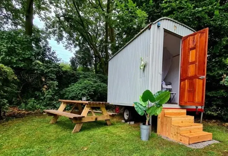 More information about Gemütliche Wohnung Nähe CentroRomantischer Bauwagen im Grünen in Oberhausen provides a cozy one-bedroom camping unit with modern comforts. The accommodation features a private garden and terrace, ideal for relaxation and outdoor activities. Guests have access to air-conditioned living spaces with garden views, along with outdoor seating and dining areas.