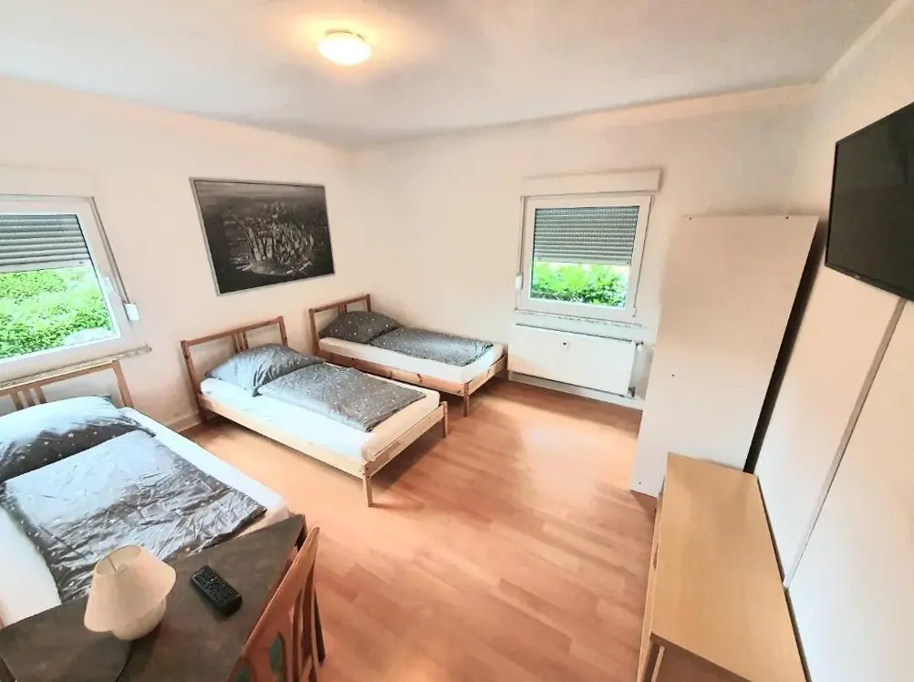 More information about Akzent Hotel OberhausenLieblingsmensch Oberhausen mit Terrasse provides spacious accommodations featuring two bedrooms and a living room. The ground-floor apartment includes a terrace with garden views and a fully equipped kitchenette. Modern amenities such as free WiFi, a washing machine, and a work desk enhance guest comfort. The unit also has a dining area with outdoor seating, a sofa bed, and a television.